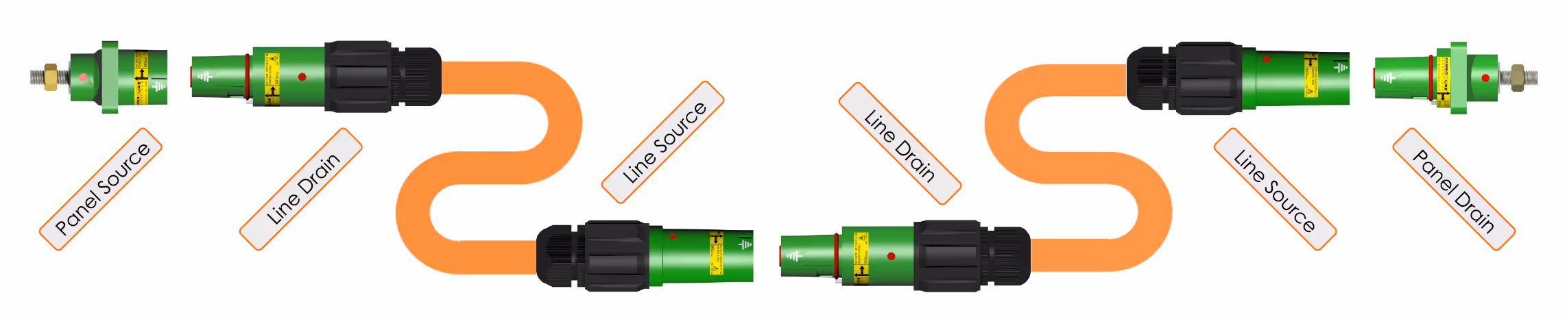 The LSP series is designed for use in the "daisy chain" system as shown below. Accordingly, there are 4 four types of connectors.